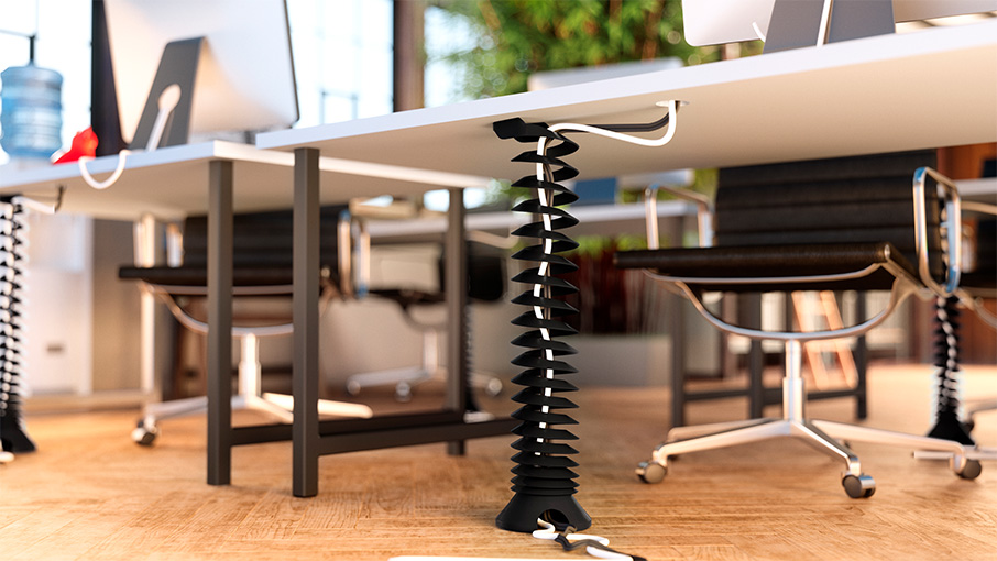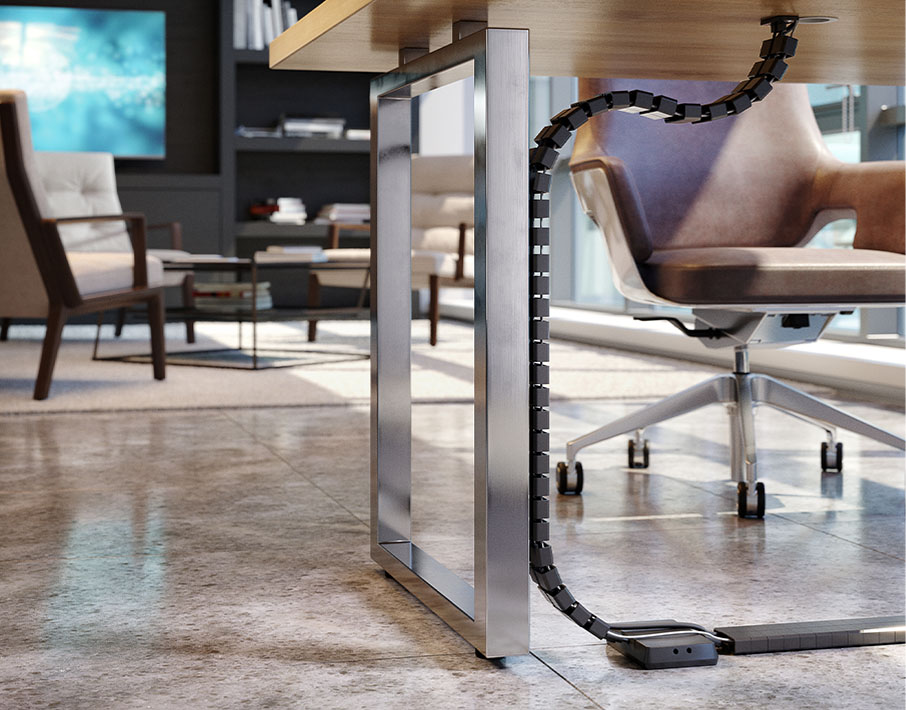 For those who want to showcase their cables in a unique way, the Snake Wire Manager is a flexible and stylish solution available in several colors. It is particularly useful for sit-stand desks or adjustable workstations, as it moves with the desk’s height adjustments. The flexible vertebrae design features rectangular blocks that snap together and can bend to accommodate various cable configurations.